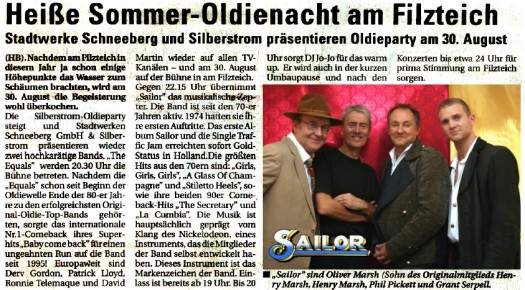 Silberstrom Oldieparty Photos by: Katrin Wagner, Karsten Wagner It could be called yet another unusual concert. Some of SAILOR's instrument and luggage had got lost at the airport. To be able to play the concert they had to stop for a late Saturday afternoon shopping excursion in Dresden to get new equipment - also including two new guitars. This caused them a lot of technical trouble (and also some stage outfit trouble!) and a crazy but fun concert... |