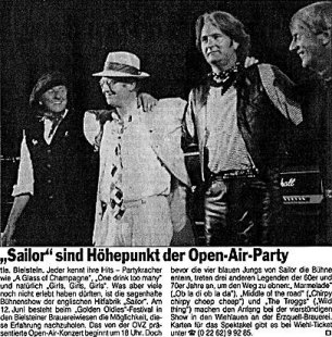 Everybody knows their hits - partycrackers like "A Glass Of Champagne", "One Drink Too Many" and of course "Girls Girls Girls". But what many people have not seen yet is the marvellous live show of the English hit- factory "SAILOR". On June 12th it will be possible to see them live at the "Golden Oldies"- Festival at the area of the brewery Bielstein. The open air concert which is presented by the OVZ starts at 6 pm. Before the four blue boys from SAILOR can finally enter the stage, three other legends from the 60s and 70s are going to perform: "Marmalade", Middle Of The Road" and "The Troggs" start the four- hour show at the Erzquell- brewery... |