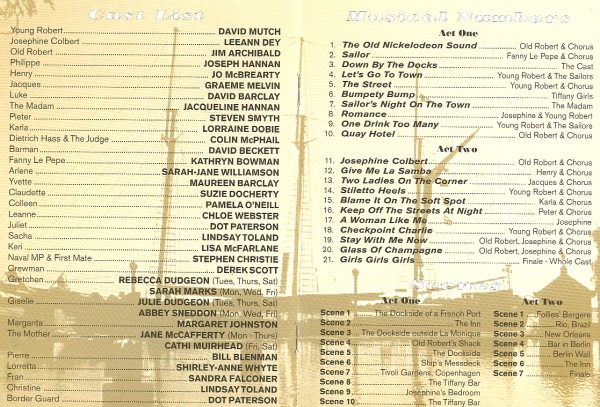 Story Synopsis of "Sailor - The Musical Journey": The story is essentially a romance. We meet Robert Leon, a former sailor living near the docks of a French fishing port. Now a lonely inebriate, he spends his life reflecting on the adventures of his past and dwelling on the hopelessness of the present. The chance meeting with a young orphan boy who befriends Robert is the vehicle which allows Roberts story to unfold. We travel back with Robert to the colourful world of his travelling Matelot days and meet Josephine, the love of his life at a brothel in Copenhagen. We learn of the destruction of the relationship when Josephine travels to East Germany and becomes trapped behind the Iron Curtain and Roberts vain attempts to rescue her and ultimately Roberts descent into the oblivion of shore life and alcohol. Life however still has a few surprises for Robert and it is just possible that happiness will not elude him forever |