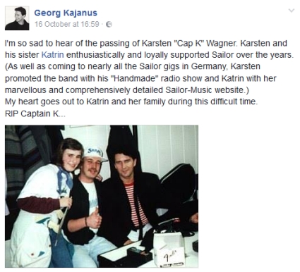 illness. . Thanks to Georg Kajanus for the lovely tribute on his Facebook page: and to all SAILORs - old and new - and all the wonderful fans/friends out there for your support. ~ Katrin |