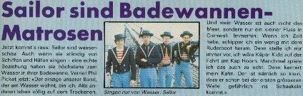 Jetzt kommt's raus: SAILOR sind wasserscheu! Auch wenn sie ständig von Schiffen und Häfen singen - eine echte Beziehung haben sie höchstens zum Wasser in ihrer Badewanne. Verriet Phil Pickett jetzt: "Der einzige in unserer Band, der am Wasser wohnt, bin ich. Alle anderen leben völlig auf dem Trockenen. Und mein Wasser ist auch nicht das meer, sondern nur ein kleiner Fluss in Cornwall. Immerhin: Wenn ich Zeit habe, schippere ich ein wenig mit dem Ruderboot herum. Dann stelle ich mir immer vor, ich wäre Käptn Kidd auf der Fahrt um Kap Hoorn. Manchmal spiele ich das auch zu echt. Dann kentert mein Kahn. Der ist nämlich so klein, dass er schon bei der ersten größeren Welle gefährlich ins Schaukeln kommt."