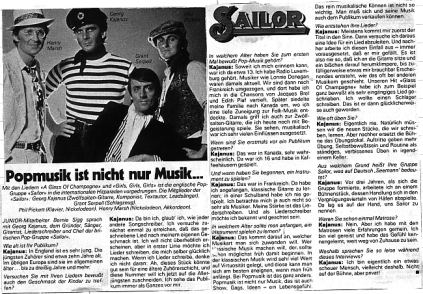 Mit den Liedern "A Glass Of Champagne" und "Girls, Girls, Girls" ist die englische Pop-Gruppe "SAILOR" in die internationalen Hitparaden vorgedrungen. Die Mitglieder der "SAILOR": Georg Kajanus (Zwölfsaiten-Gitarre, Komponist, Textautor, Leadsänger). Grant Serpell (Schlagzeug). Phil Pickett (Klavier, Nickelodeon). Henry Marsh (Nickelodeon, Akkordeon).
