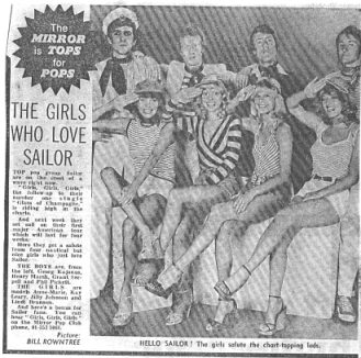 reitet gerade auf einer großen Welle. "Girls, Girls, Girls", der Nachfolge-Hit ihrer Nummer-Eins-Single "A Glass Of Champagne" ist weit oben in den Charts. Und nächste Woche setzen sie die Segel für ihre erste Amerika Tour, die vier Wochen lang dauern wird. Hier salutieren ihnen vier maritime aber nette Mädchen, die SAILOR einfach lieben. Die Jungs sind, von links, Georg Kajanus, Henry Marsh, Grant Serpell und Phil Pickett. Die Girls sind die Models Anne-Marie, Kay Leary, Jilly Johnson und Lindi Branson. Und hier ist ein Bonus für SAILOR Fans. Ihr könnt "Girls, Girls, Girls" am Mirror Pop Club Telefon hören, 01-353 3066. Der Text unter dem Bild: |