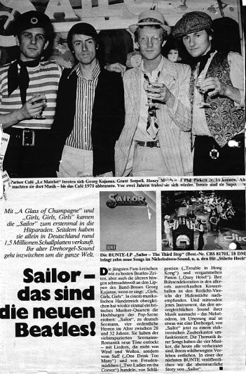 Die jüngsten Fans kreischen wie zu besten Beatles-Zeiten, aber auch die älteren hängen sehnsuchtsvoll an den Lippen des Band-Bosses Georg Kajanus, wenn er singt: "Girls, Girls, Girls". In einem musikalischen Handstreich ohnegleichen hat wieder einmal ein britisches Musiker-Quartett die Hochburgen der Pop-Szene erobert: "SAILOR", zu deutsch Seemann, vier ordentliche Herren im Alter zwischen 28 und 32 Jahren. Sie haben der vielstrapazierten Seemanns-Romantik neue Töne entlockt - mit Liedern, die nicht von Wind und Wellen, sondern vom Suff ("One Drink Too Many") und von Freudenmädchen ("Two Ladies On The Corner") handeln, von Schlägereien ("Trouble In Hong Kong") und vergammelten Finten ("Quay Hotel"). Ihre Bühnendekoration in den allerorts ausverkauften Konzerthallen ist den Rotlicht-Vierteln der Hafenstädte nachempfunden. Und mittendrin jenes Instrument, das den unvergleichlichen Sound ihrer Musik ausmacht - das Nickelodeon, im Ursprung mal so etwas wie eine Drehorgel, von "SAILOR" jetzt zu einem elektronischen Zauberkasten umfunktioniert. Die Thematik ihrer Songs haben die vier Musiker, die heute alle verheiratet sind, ihrem wildbewegten Vorleben entliehen. In einer der nächsten BUNTE veröffentlichen wir die abenteuerliche Story von "SAILOR".