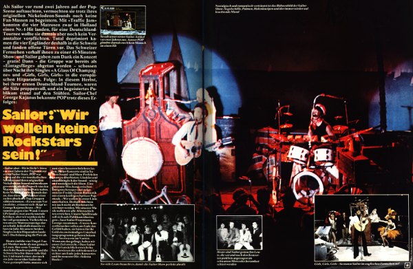 Als SAILOR vor rund zwei Jahren auf der Pop-Szene auftauchten, vermochten sie trotz ihres originellen Nickelodeon-Sounds noch keine Fan-Massen zu begeistern. Mit "Traffic Jam" konnten die vier Matrosen zwar in Holland einen Nr.-1-Hit landen, für eine Deutschland-Tournee wollte sie damals aber noch kein Veranstalter verpflichten. Total deprimiert kamen die vier Engländer deshalb in die Schweiz und fanden offene Türen vor. Das Schweizer Fernsehen verhalf ihnen zu einer 45-Minuten-Show; und SAILOR gaben zum Dank ein Konzert - gratis! Dann - die Gruppe war bereits als "Eintagsfliege" abgetan worden - schossen über Nacht ihre Singles "A Glass Of Champagne" und "Girls, Girls, Girls" in die europäischen Hitparaden. Folge: In diesem Herbst, bei ihrer ersten Deutschland-Tournee, waren die Säle proppenvoll, und ein begeistertes Publikum stand auf den Stühlen. SAILOR-Chef Georg Kajanus bekannte POP trotz dieses Erfolges: "Wir wollen keine Rockstars sein!"