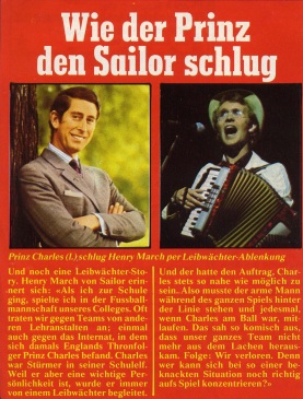 Und noch eine Leibwächter-Story. Henry Marsh von SAILOR erinnert sich: "Als ich zur Schule ging, spielte ich in der Fußballmannschaft unseres Colleges. Oft traten wir gegen Teams von anderen Lehranstalten an; einmal auch gegen das Internat, in dem sich damals Englands Thronfolger Prinz Charles befand. Charles war Stürmer in seiner Schulelf. Weil er aber eine wichtige Persönlichkeit ist, wurde er immer von einem Leibwächter begleitet. Und der hatte den Auftrag, Charles stets so nahe wie möglich zu sein. Also musste der arme Mann während des ganzen Spiels hinter der Linie stehen und jedesmal, wenn Charles am Ball war, mitlaufen. Das sah so komisch aus, dass unser ganzes Team nicht mehr aus dem Lachen herauskam. Folge: Wir verloren. Denn wer kann sich bei so einer beknackten Situation noch richtig aufs Spiel konzentrieren?"