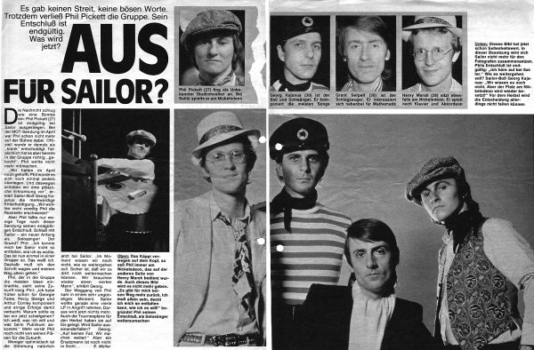 Unten: Dieses Bild hat jetzt schon Seltenheitswert. In dieser Besetzung wird sich SAILOR nicht mehr für den Fotografen zusammensetzen. Phils Entschluss ist endgültig: "Ich höre auf bei SAILOR." Wie es weitergehen soll? SAILOR-Boss Georg Kajanus: "Wir wissen es noch nicht. Aber der Platz am Nickelodeon wird wieder besetzt!" Vor dem Herbst wird die Entscheidung allerdings nicht fallen können.