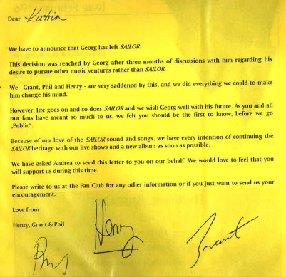 Der offizielle Fanclub Newsletter mit der Ankündigung von Georg Kajanus' Entscheidung, SAILOR zu verlassen: